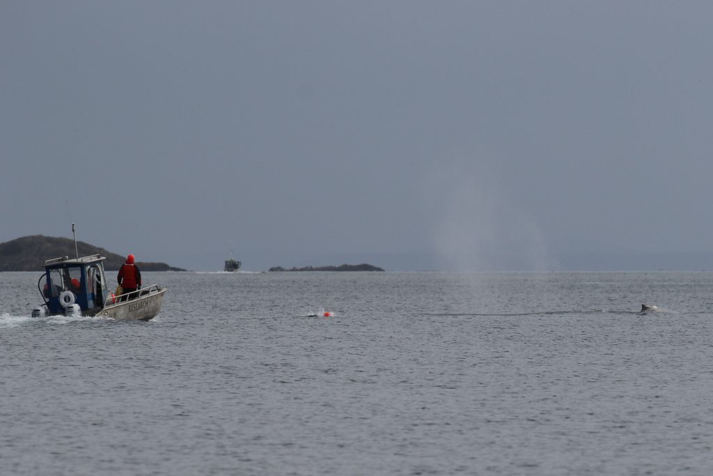 The Large Whale Entanglement Response Team from San Juan County prepares to attach a telemetry buoy to the entangling gear, allowing responders to track the animal overnight. Images Collected in Partnership with The Whale Museum & SeaDoc Society, Permit #24359.