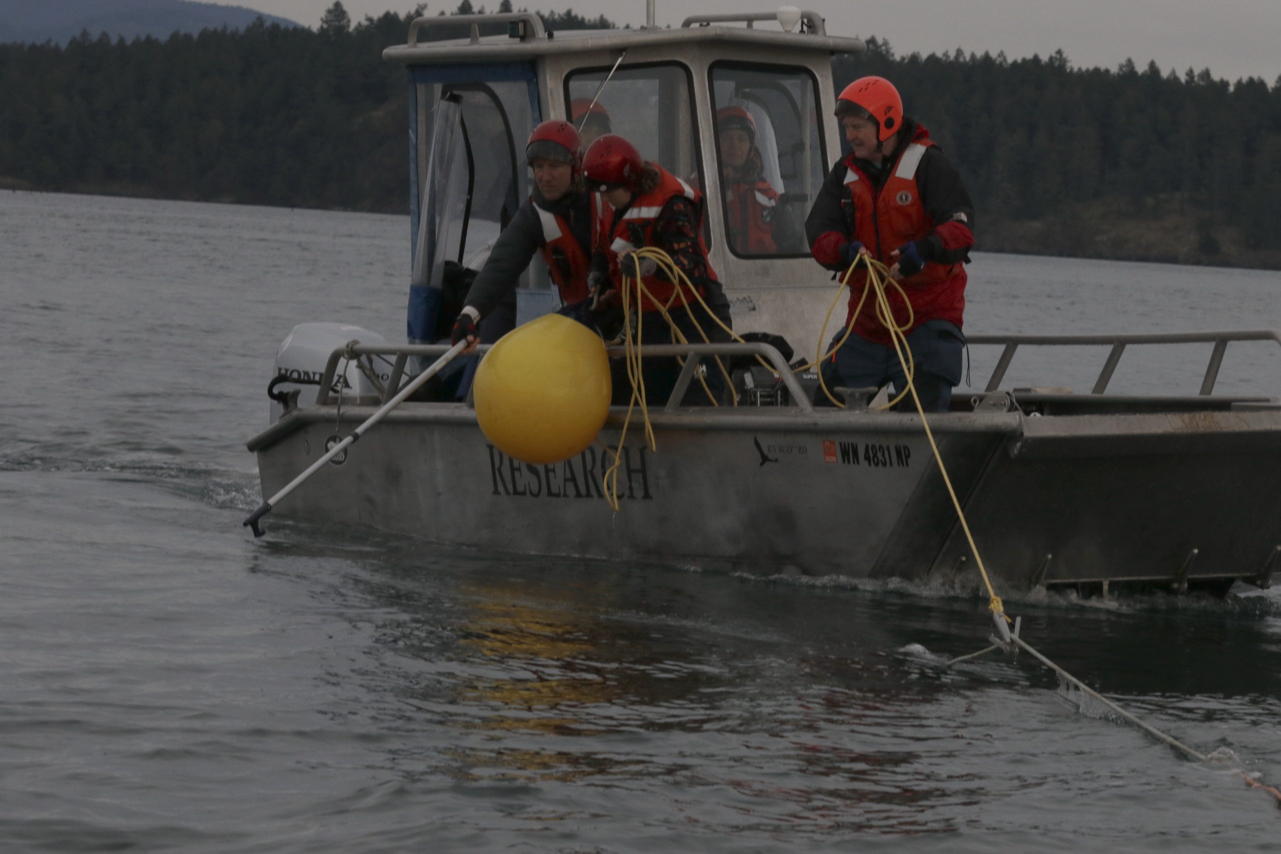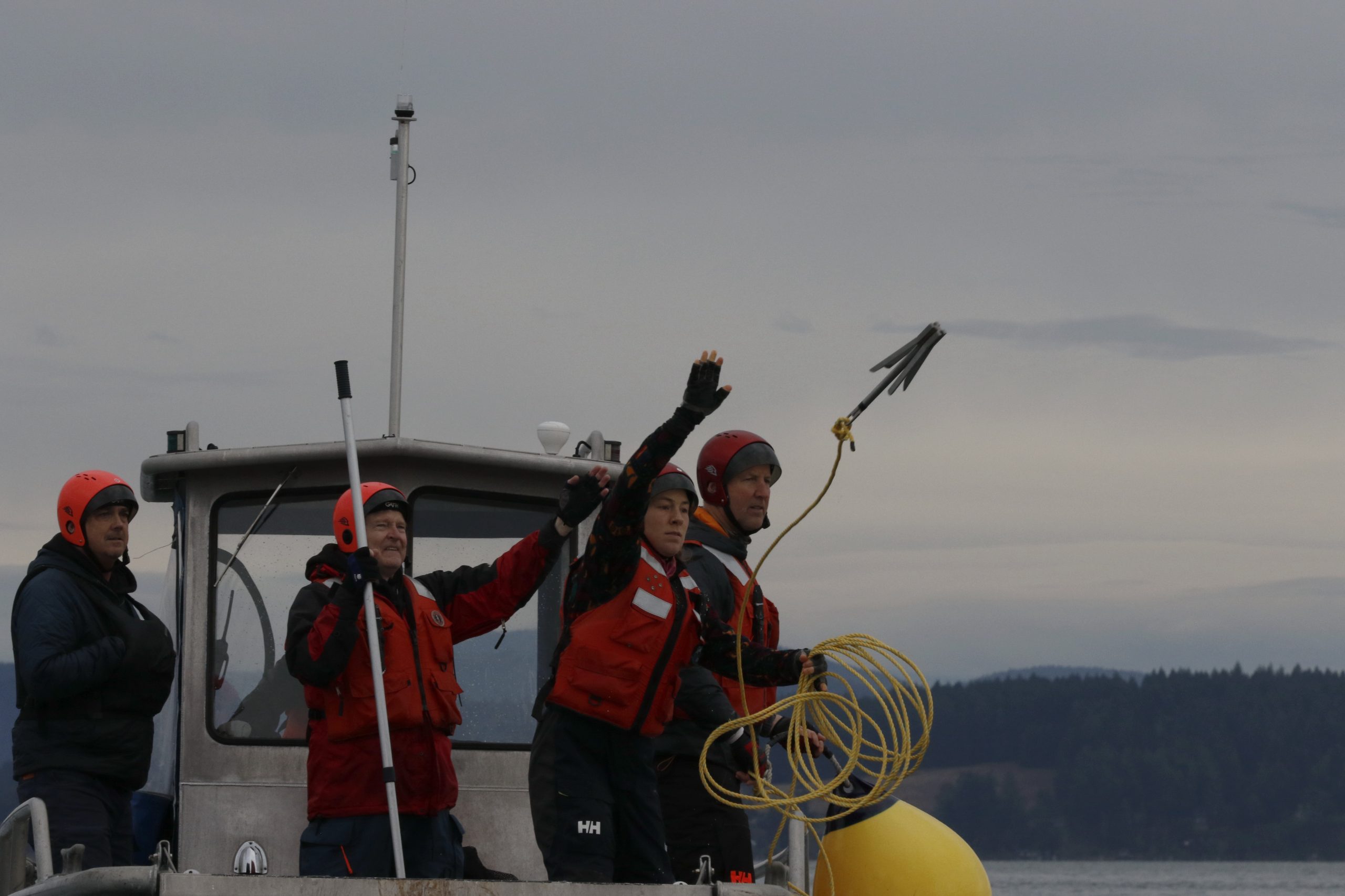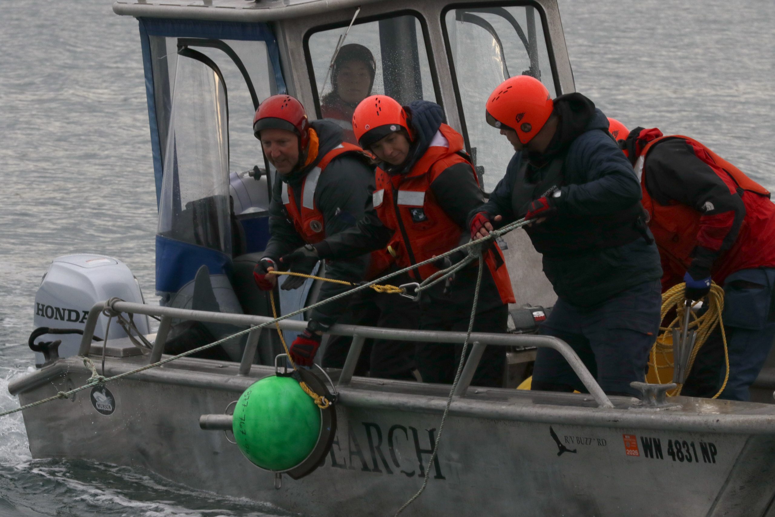 The Large Whale Entanglement Response Team from San Juan County trained with one of Cascadia’s advanced responders in early November. The multi-day training included on-water approaches from R/V Buzzard to attach a telemetry buoy to the entangling gear using a grapple and control line.