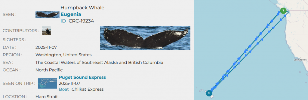 We know Eugenia will be heading to Hawaii this winter thanks to HappyWhale, a collaborative project that gathers sightings from researchers, whale-watching organizations, and citizen scientists. You can see the sighting history of Eugenia, known to West Coast researchers as CRC-19234 and BCX1493, by clicking the image.