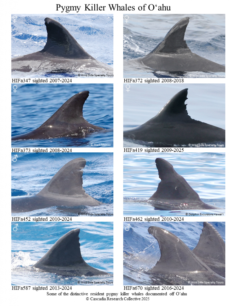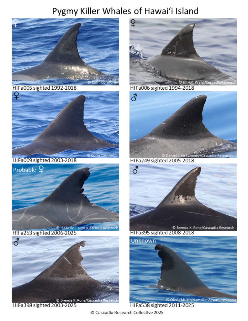The pygmy killer whale, a small toothed whale found in tropical oceanic waters world-wide, is one of the least-frequently encountered species of delphinids (oceanic dolphins) in the world. More is known about pygmy killer whales in Hawai‘i than anywhere else in the world, based primarily on a long-term photo-identification study originally started by researcher Dan McSweeney of the Wild Whale Research Foundation, a non-profit group based on the island of Hawai‘i. Dan’s observations were combined with additional photo-identification effort since 2000 by Cascadia Research Collective, and results were published in Marine Mammal Science in 2009. This study has continued to date, based on our work and contributions of photos by many others, including tour operators and ocean users from Wai‘anae to Kona. Currently, we have data on pygmy killer whales from over 200 encounters and 6 satellite-tag deployments, with many photographs contributed by citizen scientists and other researchers, and we have over 400 distinctive individuals in our photo-ID catalog for this species! The most expansive sighting record we have is of an individual (HIFa373) seen 63 times between 2008 and 2020!