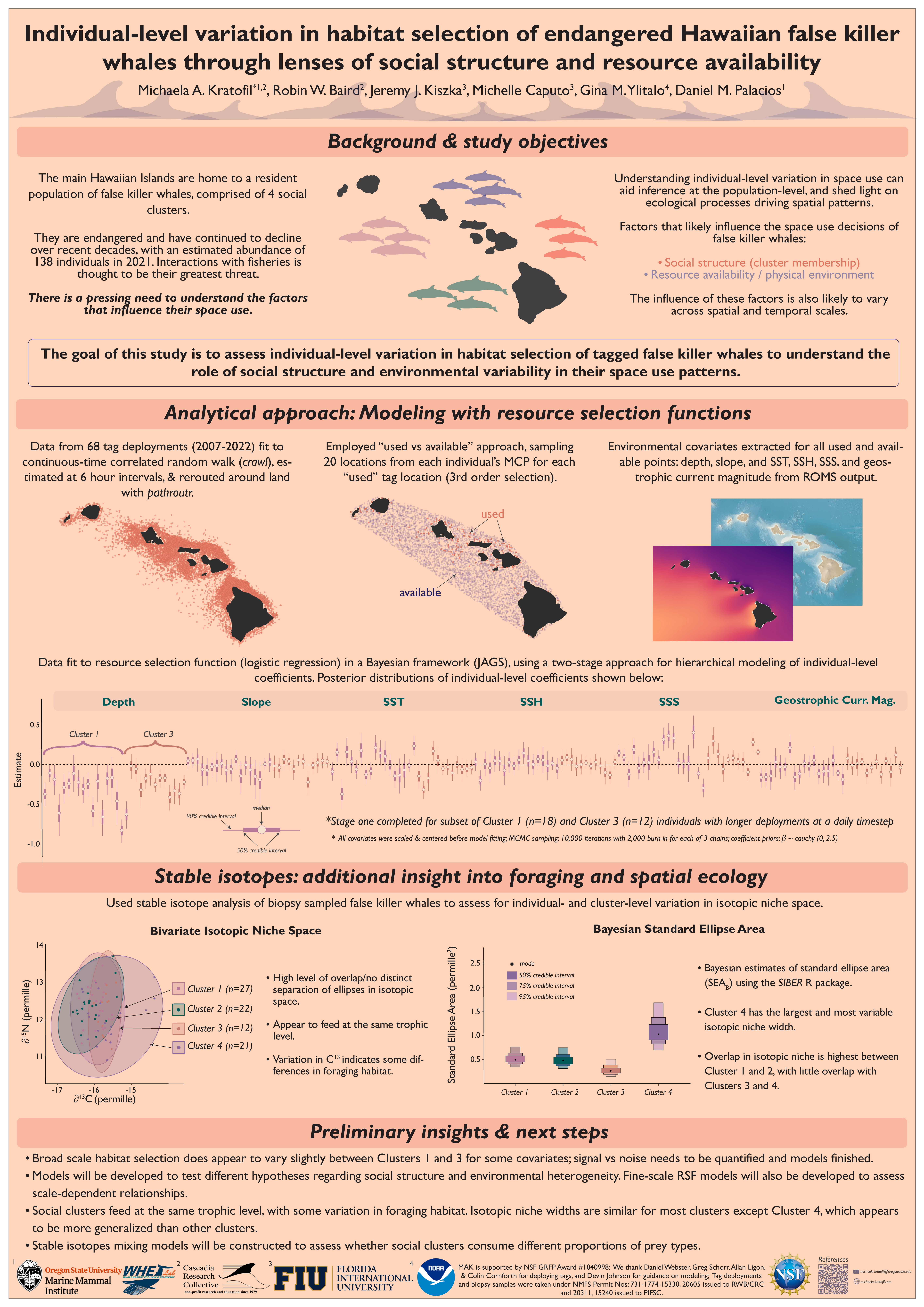 Kratofil, M.A., R.W. Baird, J.J. Kiszka, M. Caputo, G.M. Ylitalo, and D.M. Palacios. 2024. Individual-Level Variation in Habitat Selection of Endangered Hawaiian False Killer Whales Through Lenses of Social Structure and Resource Availability. Presentation at the 8th International Bio-logging Science Symposium, Tokyo, Japan, 4-8 March 2024.